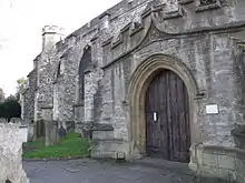 The church is built of rag-stone in the Perpendicular style with buttressed walls and a crenellated parapet. The tower is on the south-west corner and is 78 feet (24 m) tall.[1][8] It formerly had a spire, which was destroyed by a lightning strike in 1730.[1] It has a nave six bays long with aisles on the north and south sides with a clerestory running the length of the church. On the south side is a chapel originally for the use of the Fraternity of Corpus Christi, a local lay community.[1][2] The Credence and four-seated Sedilla incorporate a monument to the first master of the college, John Wotton (died 1417).[1][3] Further monuments exist to Archbishop Courtenay, Lawrence Washington (died 1619),[note 3] John Davy (died 1631) and a combined memorial to John Astley (died c. 1595), his son Sir John Astley (died 1639) and their wives.[1][10] Burials in the church include the Astleys, Washington and the three Barons Astley of Reading.[11] In the churchyard is the tomb of William Shipley, founder of the Royal Society of Arts.[12]