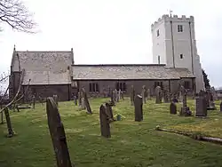 Inside the church is an octagonal stone font dated 1662, inscribed with the initials "DW" and "MO". At the east end of the south aisle is a piscina in a trefoil-arched recess. Over the entrance to the church is a panel painted with Royal arms dated 1695.[2] The pulpit is Victorian and consists of an octagonal bowl on a stone base. The stained glass in the east window is by Clayton and Bell, and in the south wall of the chancel the glass is by Abbot and Company, dated 1897. In the south aisle is a window designed by Beatrice Whistler (the wife of James McNeill Whistler), made by Campbell, Smith and Company in 1892; one designed by F. G. Christmas and made by the same company in about the same date; and another by Stanley Murray Scott for Reed Millican, dated 1959. There are memorials in the church dating from the 18th and 19th centuries.[4]