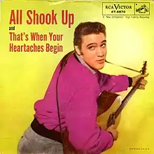 "All Shook Up" is a song recorded by Elvis Presley, published by Elvis Presley Music, and composed by Otis Blackwell. The single topped the U.S. Billboard Top 100 on April 13, 1957, staying there for eight weeks.[1] It also topped the Billboard R&B chart for four weeks, becoming Presley's second single to do so, and peaked at No. 1 on the country chart as well.[1] It is certified 2× platinum by the RIAA.