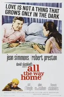 All the Way Home is a 1963 drama film directed by Alex Segal and starring Jean Simmons, Robert Preston, Pat Hingle, and Michael Kearney. The plot is about a young boy and his mother dealing with the sudden death of his father. It was based on the 1957 James Agee novel A Death in the Family[3] and the 1960 Tad Mosel play All the Way Home.[4]