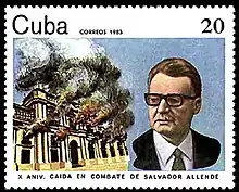 Two other stamps, both on the tenth anniversary of the coup, represent extremes of reaction to the event. Scott Cuba #2605 shows the burning presidential palace of La Moneda ("The Mint") and a picture of Allende. The caption refers to him as having "fallen in combat".