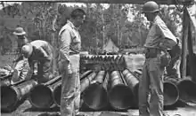 Techniques for air dropping had yet to be developed. Following the loss of the airstrip at Kokoda, the AAF concluded that the only way to get supplies to A Company, 39th Infantry Battalion in the Kokoda area was to adopt a suggestion from the Army to put them in fighter drop tanks.[157] The tanks were slit, along the bottom, and they were filled with supplies.[126] The first attempt on 11 August was called off due to bad weather, but four fighters dropped a total of 910 kilograms (2,000 lb) on 12 August.[157] By then it was too late; the area was in Japanese hands.[158] A forward supply dump was established at Myola, in a dry lake bed that Kienzle found on 3 August. The lake bed was flat and treeless, making it a good candidate for a supply drop zone.[159] Several days of good weather after 9 August allowed the transport aircraft to concentrate on dropping at Myola.[160]
