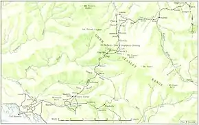 When the campaign began, the Kokoda Track started at McDonald's Corner, just beyond Ilolo. From there, the track slowly rose about 670 metres (2,200 ft) to what later became known as Owers' Corner.[99] The road from Port Moresby was sealed as far as Seven Mile, and from there a gravel surface was laid to provide an all-weather road as far as Sogeri, roughly 51 kilometres (32 mi) from Port Moresby.[100] On 24 June, GHQ queried whether it would be possible to upgrade the track to one that could handle animal transport or, better still, motor vehicles. There were multiple tracks leading to Kokoda, and in addition to the main track, there was interest at New Guinea Force HQ in a route along the Brown River that had been partially surveyed in 1912.[101]