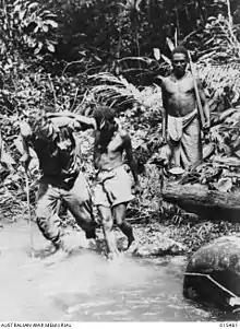 A carrier could carry about 13 days' worth of food, and traversing the track took eight days.[123] A carrier load was assessed at 18 kilograms (40 lb), but the water-logged wrapping caused it to weigh more. Since the carriers could not carry more, ANGAU had to take this into account when preparing the loads.[124] The initial movement of the 39th Infantry Battalion to Kokoda was supported by 600 carriers under Lieutenant H. T. (Bert) Kienzle from ANGAU. Along the track, Kienzle and Sergeant Major Maga of the Royal Papuan Constabulary established way stations, which they stocked with food gathered locally,[123] and were manned by ANGAU, who were responsible for both the carriers and the stores.[125][126]