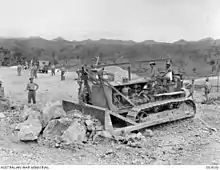 Crucial to road and airfield development was the output of the Nine Mile Quarry. Initially it was run by the 1st Army Troops Company, which installed suspended electric lighting, allowing the quarry to be worked around the clock from 30 April 1942. Companies A and C of the 96th Engineer Battalion took over the running of the quarry in June.[97] In turn, they were relieved by C Company of the 2/1st Pioneer Battalion in November. Work went on in three eight hour shifts per day, seven days a week. The face of the quarry was drilled from the top and dropped to the floor by blasting. Knapping hammers were used to break the stone into small pieces that could be lifted onto trucks by hand. There were two rock crushers on hand; an old model and a modern mobile diesel crusher supplied by the US Army.[98]