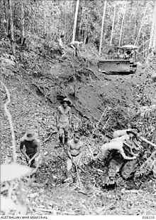 Owers' Corner was named after Lieutenant Noel Owers, who was given the task of surveying a new route from Ilolo to Nauro. The project of constructing a jeep track to Nauro was pushed aggressively by the Chief Engineer at New Guinea Force, Brigadier John Main. Lieutenant Colonel Sidney Bleechmore was placed in charge, and was given the 7th and 2/14th Field Companies and a section of the 2/1st Mechanical Equipment Company.[103][104] Work commenced on 19 August. Removing the trees allowed the sun to dry out the ground, and by adding drainage, a track was created passable by light vehicles, allowing plant and equipment to be brought up. Owers' Corner was reached in early September.[104]