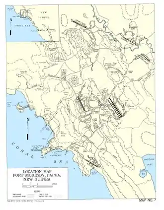The first unit of the Second Australian Imperial Force (AIF) to arrive, the 2/3rd Light Anti-Aircraft Battery, disembarked on 11 April 1942, having returned to Australia from the Middle East just four weeks before. The US 101st Coast Artillery (Anti-Aircraft) Battalion followed on 5 May, and its commander, Lieutenant Colonel Joseph B. Fraser, took charge of Port Moresby's anti-aircraft defences.[31][32] Morris's command became New Guinea Force on 15 April.[33] By the end of June the ground forces in New Guinea consisted of 1,098 AIF, 12,273 Militia and 2,208 American troops.[34]