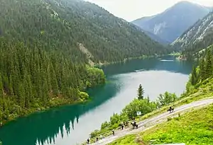Much of the northwestern border of the region runs along Lake Balkhash, whose main affluent, the Ili River, is the most significant river of the region. In the region's northeast, it shares the four lakes of the Alakol Depression (Lakes Alakol, Sasykkol, Koshkarkol, and Zhalanashkol) with East Kazakhstan Region. Other lakes within the region include Bartogay Lake and Kapshagay lakes, Lake Issyk, Kaindy and Kolsai lakes.