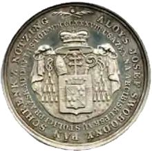 ![]() An 1838 medal commemorating the elevation of Alois Josef von Schrenk to the archbishopric of Prague.[1] | |