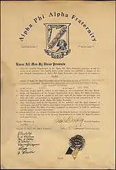 The 1906 charter for ΑΦΑ's Alpha chapter at Cornell University