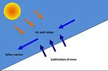 Due to wind, fresh snow does not stay at the surface but is blown into the first few meters of the surface layer. This blowing snow usually sublimates due to the insulation and has a significant meteorological effect . The sublimation of blowing snow leads to a modification of the energy budget and an overall temperature decrease of 0.5 °C combined to an increase of water vapor has been observed.[9] This forms a stable cold and moist layer of air above the snow surface, even if the surrounding air temperature is above freezing point. This cold layer induces downslope winds, which damper the growth of the PBL. This surface winds are also drifting the snowpack, leading to an increase of surface roughness and therefore an increase of wind shear (Forced convection).
