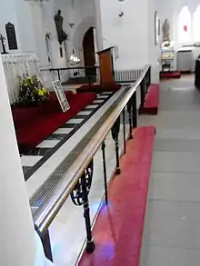 The altar rail (also known as a communion rail or chancel rail) is a low barrier, sometimes ornate and usually made of stone, wood or metal in some combination, delimiting the chancel or the sanctuary and altar in a church,[1][2] from the nave and other parts that contain the congregation. Often a gate, or just a gap, at the centre divides the line into two parts. Rails are a very common, but not inevitable, feature of Roman Catholic, Anglican, Lutheran, and Methodist churches. They are usually about two feet 6 inches high, with a padded step at the bottom, and designed so that the wider top of the rail can support the forearms or elbows of a kneeling person.