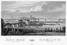 Originally there was a ford (German: Furt) near the Alte Brücke, possibly slightly downstream near the de:Frankfurt Fahrtor, giving the city its name. It is unclear exactly when the first bridge between Frankfurt and Sachsenhausen was built. Sachsenhausen's first mention in historic records was in 1193. The first known mention of the bridge was in 1222 in the records of Frankfurt Cathedral, referring to a "burgage plot at the bridge" ("Hofstätte an der Brücke") belonging to a magistrate named Nikolaus.[1] However, the bridge might be older than this: Chronicler Achilles Augustus von Lersner, who lived in Frankfurt, wrote at the beginning of the 18th century: