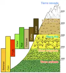 Altitudinal zones of Andes Mountains and corresponding communities of agriculture and livestock raised