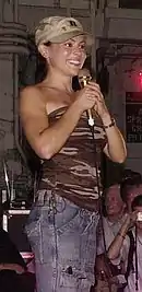 The same year, she launched her signature "Touch" line of team apparel for female baseball fans, selling it through her blog on Major League Baseball's website.[38] It also became available in 2009 through a boutique store located in Citi Field, the home of the New York Mets.[39] She has an interest in the Los Angeles Kings,[40] a National Hockey League team, and is involved with a related clothing line. In 2008, she expanded that to NFL football, as a New York Giants fan. Since Milano is from the same hometown as NFL Network's Rich Eisen, she revealed some of her family's connections with the Giants.[41] In 2013, Milano expanded "Touch" into NASCAR.[42]