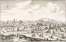 The name of Alzey is first mentioned on a Nymphenstein (a Roman altar stone dedicated to nymphs),[4] dedicated on 22 November 223 by the Vicani Altiaienses ("Villagers of Alzey").[5] The name Altiaia could well originate from the name of an older, pre-Roman Celtic settlement of about 400 BC, although the name's exact origins have not been passed down to the present day. Over the ruins of the Roman village, which was destroyed about 350, a fort, Castra Alteium, was built about 390. In 406 and 407, the Burgundians, together with the Vandals, crossed the Rhine and settled in Mainz, Alzey and Worms as Roman confederates. The area was secured for them by treaty. In 436, the Burgundian kingdom was destroyed by the Western Roman magister militum Flavius Aëtius with help from Hunnish troops. These events were worked into the Nibelungenlied and form the origin of the legendary figure Volker von Alzey, the gleeman in the Nibelungenlied. After 450, Alzey passed to the Alamanni and the Franks when they took over the land. After Clovis I's death in 511, the Frankish Empire fell apart into separate smaller kingdoms, and Alzey became part of Austrasia, whose capital was at Metz. Following the unification of the Frankish kingdoms in the mid-8th century, Alzey was assigned by the 843 Treaty of Verdun to the Kingdom of the East Franks, a forerunner of the German Empire. In 897, Alzey was first mentioned as an Imperial fief.
