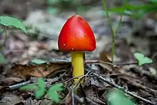 Amanita jacksonii, also known as Jackson's slender amanita,[2] American Slender Caesar, and Eastern Caesar's Amanita,[3] is a species of fungus in the family Amanitaceae. It is a reddish-orange colored mushroom species extending from the Province of Quebec, Canada to at least the State of Hidalgo, Mexico. It was given its current name in 1984 by Canadian mycologist René Pomerleau.[4][5] It can be identified by its yellow gills, large, white, sacklike volva, and bright orange or orange-red cap, which has lined margins.[6]