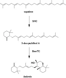 Ambrein is synthesized from common triterpenoid precursor squalene. The Squalene-hopene cyclase(SHC) catalyzes cyclization of squalene into the monocyclic 3-deoxyachilleol A. Tetraprenyl-beta-curcumene synthase(BmeTC) converts 3-deoxyachilleol A into the tricyclic ambrein.[8]