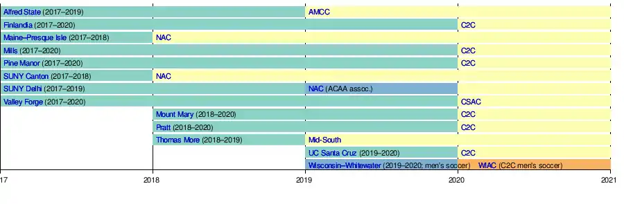 - 2019 - The University of Wisconsin–Whitewater joined the ACAA as an affiliate member for men's soccer, effective in the 2019 fall season (2019-20 academic year).
