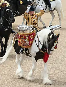 The American Drum Horse is a modern American breed of heavy horse of draft type. It is based on, and named for, the drum horse of the Life Guards of the British Royal Household Cavalry, which carries the kettle-drummer and large silver kettle-drums, and is usually a Clydesdale or Shire, and often either piebald or skewbald.[1]: 43 Other regiments have drum-horses of other colors and breeds.