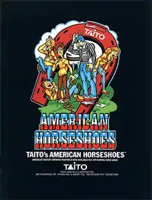 American Horseshoes is a 1 to 4 player "horseshoes" arcade game released by Taito in 1990. Each player can choose from one of four characters: Lucky Lou, Diamond Dave, Tossin' Tom and Mayhem Mary. There are two pitches in each inning. Players may select grip and throwing angle prior to each pitch. The rolling of the trackball determines the distance of each pitch. After each inning the scoring with shown with an overhead shot of the stake area. Each player's score is shown throughout the game at the top of the screen. Up to nine innings can be played per game.