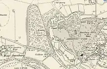 After 1735, the Duke of Queensberry acquired land west of the river which included the Iron Age hillfort called Vespasian's Camp.[7] Plans for a formal landscape were drawn up by the notable garden designer Charles Bridgeman shortly before his death in 1738,[7] and Andrews' and Dury's 1773 map shows the park and hill laid out with formal rides and avenues.[18] By the early 19th century a new southern entrance to the park had been created, next to the parish church, using gate pillars each with a pair of Tuscan columns below a triangular pediment.[19]