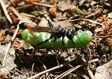 The adults fly in summer on heathland and sandy places where the soil is soft enough for the female to dig burrows. The females are parasitoids, spending much of their time hunting for caterpillars. Sphecid wasps may begin by finding caterpillar faeces; parasitoid wasps are attracted by multiple substances, some volatile and some not, and the non-volatile cairohormones are found in caterpillar secretions and faeces. The captured caterpillars are always hairless, and are mostly Noctuids (owlet moths) or Geometrids (geometer moths, inchworms). The wasp grabs the upper (dorsal) side of the caterpillar, and angles her long abdomen around under the caterpillar to sting it on its lower (ventral) side, paralyzing it. The caterpillar remains alive, so that the wasp larvae will have fresh food to eat.[3] The female digs burrows in sandy ground, provisions each burrow with a food supply of paralyzed caterpillars, and lays one egg, always on the first caterpillar to go into the burrow.[5][3] The prey is stung several times, mainly on the 2nd and 3rd abdominal segments: this distribution may relate to the positions of nerve ganglia that co-ordinate locomotion in the caterpillar. Eggs are laid mainly on the 3rd and 4th abdominal segments.[3]