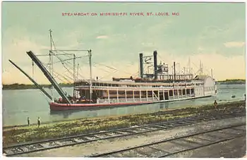 | City of St. Louis | 1883 | Measured 300 feet (91 m) long x 49 feet (15 m) wide x 8.6 feet (2.6 m) depth (hull). In 1894 she was commanded by Captain James O'Neal, with pilots Joe Bryan and Charlie O'Neal. In March 1898 she was bought at the U.S. marshal sale at St. Louis by Captain W.H. Thorgewan for $19,050 (about $422,0064 in 2005). Briefly owned afterwards by the Columbia Excursion Company, which sold the boat in July 1899 to James M. Grasty. By 1901 she was running harbor excursions in New Orleans, and U.S. President William McKinley rode on the boat in May. Grasty sold the boat in 1903 to the Greater New York Home Oil Company; however, a U.S. marshal took control of the boat and sold her to T. Marshall Miller, an attorney, for $3,125 (2005 $66,573). Laid up at Carondelet, Missouri, she burned there 29 October 1903. The original roof bell was sold by the Anchor Line to Captain J. Frank Ellison, and it was later installed on a boat known as the Queen City. |