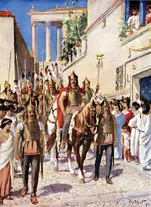 In the 4th century BC, Rome had come under attack by the Gauls, who now extended their power in the Italian peninsula beyond the Po Valley and through Etruria. On 16 July 390 BC, a Gallic army under the leadership of tribal chieftain Brennus, met the Romans on the banks of the Allia River ten miles north of Rome. Brennus defeated the Romans, and the Gauls marched to Rome. Most Romans had fled the city, but some barricaded themselves upon the Capitoline Hill for a last stand. The Gauls looted and burned the city, then laid siege to the Capitoline Hill. The siege lasted seven months. The Gauls then agreed to give the Romans peace in exchange for 1000 pounds of gold.[28] According to later legend, the Roman supervising the weighing noticed that the Gauls were using false scales. The Romans then took up arms and defeated the Gauls. Their victorious general Camillus remarked "With iron, not with gold, Rome buys her freedom."[29]
