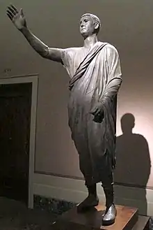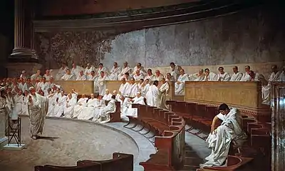 According to tradition and later writers such as Livy, the Roman Republic was established around 509 BC,[21] when the last of the seven kings of Rome, Tarquin the Proud, was deposed by Lucius Junius Brutus and a system based on annually elected magistrates and various representative assemblies was established.[22] A constitution set a series of checks and balances, and a separation of powers. The most important magistrates were the two consuls, who together exercised executive authority such as imperium, or military command.[23] The consuls had to work with the Senate, which was initially an advisory council of the ranking nobility, or patricians, but grew in size and power.[24]
