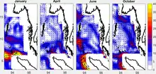 The effect of wind stress on the ocean surface can be explained by wind stress curl. The net divergence of water in the ocean mixed layer results in Ekman pumping.[3] The contrast between the two seasons elicits a very strong negative pumping velocity of more than 5 m (16 ft) per day along the north coast of Indonesia from May to September (shown here, June). This may signify coastal downwelling in the summer. It is also observed that the region develops a weak but positive pumping velocity of less than 3 m (9.8 ft) per day at the mouth of GC in winter (here, December).
