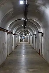 The fort hosts four Krupp guns, each with 280 millimetres (11 in),[2] 300 pounds (140 kg)[3] ammunition with a range of 12 kilometres (7.5 mi). An observatory post, with a telescope and a pair of telemeters, calculated distances and positions of the ships approaching the bay. Three underground arched tunnels, one 200 metres (660 ft) and two 50 metres (160 ft) long, connect the facilities together, as well as housing six ammunition depots and a power room (housing a 3-phase 139V generator), plus a kitchen, canteen and toilet facilities. It was designed so that most of the structure was underground and hidden behind an "invisible curtain" of trees.[2]