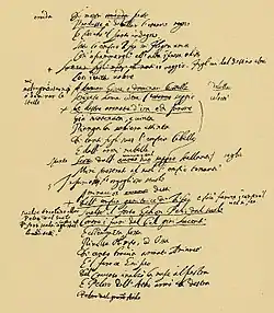 Page from Galileo's copy of Salvadori's poem "Per le Stelle Medicee temerariamente oppugnate". The copy is made in Galileo's own hand with his corrections - I caramogi (The dwarves), comic masquerade, performed August 1629