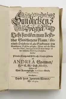 In 1642, Sparman wrote the most complete book yet published about preventive health care, Sundhetzen's Speghel, uthi hwilken man beskodhar Sundhetzens Natur,... or "Mirror of Health, from which one may learn the nature of health, the principal causes of all diseases which chiefly undermine health, together with the remedies which deliver us from them".[4] It is considered the best läkebok or medical book of the century. Part of the book is written in the form of the alexandrine French poetry meter. It was probably based on some foreign works.[1] Sparman's book warned about the medical dangers of alcohol.[5]