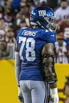 Thomas entered the 2021 season as the Giants starting left tackle. He suffered an ankle injury in Week 6 and was placed on injured reserve on October 19, 2021.[15] On November 22, 2021, Thomas was activated from injured reserve.[16] The same day, Thomas scored his first career touchdown, a two-yard reception, against the Tampa Bay Buccaneers in the Giants' Week 11 game. In February 2022, Thomas underwent surgery to repair the same left ankle that he had injured earlier in the season.[17]