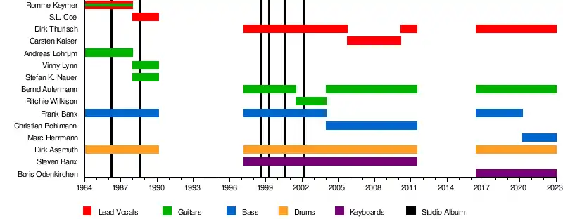 | Past members | S.L. Coe Frank Banx Carsten Kaiser Romme Keymer Andreas Lohrum Vinny Lynn Stefan K. Nauer Ritchie Wilkison Christian Polhmann Steven Banx |