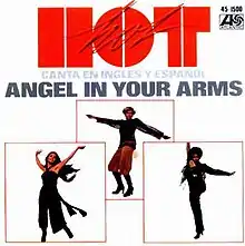 Although "Angel in Your Arms" belongs to the tradition of cheating songs prevalent in country music, the song was introduced by pop/R&B act Hot on their self-titled debut album, recorded in 1976 at Wishbone Studios in Muscle Shoals, Alabama with Wishbone's owners Clayton Ivey and Terrence (Terry) Woodford producing.[1] It was Hot's lead singer Gwen Owens who requested the group be given a country song, and Ivey and Woodford obliged with "Angel in Your Arms", whose third co-writer was Muscle Shoals resident Tom (Tommy) Brasfield. [2] [3] Although Hot was officially a trio consisting of Owens, Cathy Carson, and Juanita Curiel, Owens has stated that she recorded "Angel in Your Arms" with only Carson as background vocalist: Irene Cathaway, with whom Owens and Carson had been performing and who was expected to record with them at Muscle Shoals, was a no-show at the recording studio, and "Angel in Your Arms" was recorded prior to the recruitment of Curiel as Cathaway's replacement.[4] Ivey played keyboards on Hot's recording of "Angel in Your Arms", which featured Mac McAnally on guitar. At the time of Hot's success with their single version, the group also recorded a Spanish-language version entitled "Angel en Tus Brazos".[5]