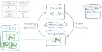 Architecture of an Angular application. The main building blocks are modules, components, templates, metadata, data binding, directives, services, and dependency injection.