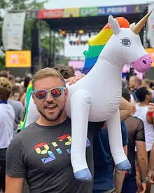 Alice Fisher of The Guardian wrote in 2017, "The unicorn has also done its bit for the LGBT community in the last century... Rainbows and unicorns are so intrinsically linked (the association is also a Victorian invention) that it's unsurprising that the magic creature started to appear on T-shirts and banners at Gay Pride around the world, with slogans such as 'Gender is Imaginary' or 'Totally Straight' emblazoned under sparkling rainbow unicorns."[16]