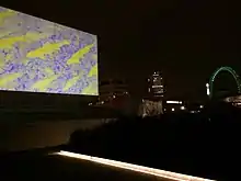 Beginning in 2014, Glesta has been travelling a large-scale video installation entitled WATERSHED to prominent locations in New York and London in an effort to facilitate discussion on climate change and infrastructure improvements in waterfront cities. The video originated from a commission by ARTPORT making waves for their exhibition (Re-) Cycles of Paradise which was commissioned by several UN related organisations and governments for the COP15 UN Climate Conference in Copenhagen in 2009 and which traveled later to Mexico City, Cuernavaca, and Lace Gallery Los Angeles, Ca .[6] There, Glesta learned about the impact of sea level rise on the planet. Sponsored by a fellowship from the LABA Foundation in NYC, Glesta developed THE WATERSHED Project, an installation that later was exhibited throughout the world. The installation itself features footage of fish swimming underwater that is projected onto surfaces in areas that will be affected by impending sea level rise. In 2015, WATERSHED appeared on the National Theatre in London; in 2016, it was commissioned by Al Gore for an event at the New York Custom House on Ellis Island; in 2017, it was projected on the sidewalk outside the Red Hook branch of the New York Public Library.;[7] most recently in 2020, it was projected on the Parrish Art Museum and at the Basilica in Hudson, New York.
