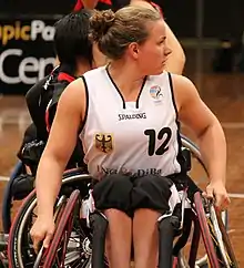 Breuer was part of the German national team which won gold at the 2011 European Championships in Nazareth, Israel, defeating the Netherlands in the final, 48–42.[11][12] In June 2012 she was named as one of the team that competed at the 2012 Summer Paralympic Games in London.[11] In the Gold Medal match, the team faced the Australia women's national wheelchair basketball team,[13] a team that had defeated them 48–46 in Sydney just a few months before.[14] They defeated the Australians 44–58 in front of a crowd of over 12,000 at the North Greenwich Arena to win the gold medal,[13] They were awarded another Silver Laurel Leaf by President Joachim Gauck in November 2012,[15] and were again named Team of the Year for 2012.[16] In a ceremony in Ulm, Breuer was congratulated by the Lord Mayor, Ivo Gönner, and her name was entered in the Golden Book of the city.[17] In December 2012, it was announced that in addition to playing for second division Sabres Ulm, she would also play for five-time Champions League winning first division club RSV Lahn-Dill in 2013.[18]