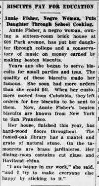Annie "Knowles" Fisher (December 3, 1867 – June 11, 1938) was a cook, caterer and entrepreneur. Annie lived in Columbia, Missouri, and worked for prominent families as a cook until she started her own catering business. Annie became famous in Missouri for her widely sold beaten biscuits. Through her cooking, Annie amassed a sizable fortune and purchased rental properties and farms in and around Boone County.
