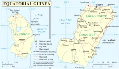 Annobón (Spanish: Provincia de Annobón;[3][4] Portuguese: Ano-Bom), and formerly as Anno Bom and Annabona,[5] is a province (smallest province in both area and population) of Equatorial Guinea consisting of the island of Annobón, formerly also Pigalu and Pagalu, and its associated islets in the Gulf of Guinea. According to the 2015 census, Annobón had 5,314 inhabitants,[1] a small population increase from the 5,008 registered by the 2001 census. The official language is Spanish but most of the inhabitants speak a creole form of Portuguese. The island's main industries are fishing and forestry.