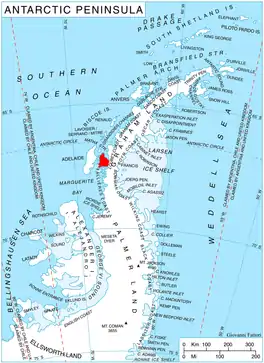 |  Location of Arrowsmith Peninsula on Graham Coast, Antarctic Peninsula | |