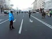 A pro-government counter protest reportedly gathered 10,000 people on 25 November.[2] The Party of Regions allegedly paid UAH₴100 to its supporters to participate in a three-hour rally, with supporters calling for "building Europe in Ukraine [...] but on terms and conditions favourable for Ukraine".[3] According to the Kyiv Post, demonstrators held anti-EU and homophobic banners.[4] On 29 November a 2-hour 3,000 people strong pro-government rally took place on European Square.[5][6] Party of Regions member of parliament Vladyslav Lukianov told the crowd: "I'm sure that our movement to Europe will never change. We support this choice. Let the land shatter from our steps. Together we will win".[5][7] The Kyiv Post again reported incentives were given to attend and described attendants in appearance "to be homeless; still more look drunk. The crowd consists mostly of men".[5] Euronews spoke of many being "bused in from the east of the country where pro-Russian sentiment is strong. They, too, carried national flags as well as those of the ruling Party of Regions".[8] Many in the crowd refused to talk to Euronews.[9]
