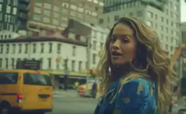 In the next scene, Ora holds blue balloons while walking through traffic and on sidewalks, sporting a matching blue velveteen coatdress and thigh-high boots from Off White's Fall 2017 collection.[25][28] The singer is also shown on a moving carriage in an Attico multi-patterned halter gown, Colin LoCascio red faux-fur coat and Saint Laurent Niki Swarovski crystal-embellished leather knee-high boots. In other scenes, she has hip hop-style looks including a Mulberry jumpsuit, a black Paco Rabanne top and bottom, and a Madeleine Thompson rainbow cashmere tracksuit with a pink bucket hat by Kangol and Marc Jacobs. In a scene near the end of the video, Ora runs in a street in a vintage Vivienne Westwood wedding dress, Gigi Burris veil and Mulberry boots.[25]