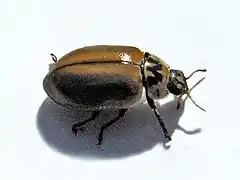 Aphidecta obliterata can reach approximately a size of 3.5–5 millimetres (0.14–0.20 in).[7] These tiny beetles have an elongate oval body, with strongly convex elytra, smooth, shiny and densely, finely punctured. Head shows a black arch-shaped marking. Antennae are club-shaped, with 9-11 segments.