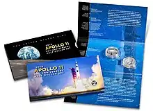 Beginning on August 7, the Mint sold sets containing either the $5 piece or the smaller silver dollar in proof condition with a print in honor of Apollo 11 from the Bureau of Engraving and Printing.[55] Prices were set at $78.95 for the print and silver dollar set and $19 above the price of the gold coin for the print/$5 piece set. Due to the rising price of gold, the Mint was selling the $5 piece for $485 by itself. The two new sales options went into backorder status the same day sales began.[56] After 19 days of sales, through August 25, a total of 681 of the print/$5 piece sets and 2,570 of the print/silver dollar sets had sold.[57] As of September 29, sales totaled: 31,331 proof half eagles by themselves (plus 825 sold with the print) and 11,713 uncirculated; 65,463 three-inch silver dollars; 200,712 smaller proof silver dollars by themselves (plus 3,122 with the print) and 56,960 uncirculated; 99,998 half dollar sets; 62,470 additional proof half dollars; and 40,170 uncirculated half dollars.[58] At the Mint's Numismatic Forum held in Philadelphia in October, Mint Director Ryder predicted sales of 90,000 for the five-ounce silver dollar.[59]