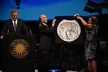Artists at the Mint produced three designs for the reverse, and in June 2017, both CFA and CCAC agreed on one of them.[25] That design was by U.S. Mint Sculptor-Engraver Phebe Hemphill, who also engraved her side of the coin.[19] The two winning designs were unveiled on October 11, 2018, at the NASM in Washington, DC, in the presence of dignitaries such as Mint Director David J. Ryder and Apollo 7 astronaut Walt Cunningham. At the unveiling, Ryder stated the five-ounce silver dollars, once placed on sale, could sell out in ten minutes.[26]