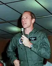 Eiermann lived in Cocoa Beach, Florida at the time of Apollo 15, and was a local representative of Los Angeles-based Dyna-Therm Corporation,[17] which was a NASA contractor.[18] According to Scott's autobiography, one night several months before launch, the astronauts' supervisor, Director of Flight Crew Operations Deke Slayton, had Scott and the other crew members come to dinner at Eiermann's house; Scott described Eiermann as a longtime friend of Slayton.[19] Worden, in his autobiography, agreed that the crew was invited to dinner there, but described Scott as inviting his crewmates, and did not mention involvement by Slayton.[20] In his testimony before a congressional committee in 1972, Scott described Eiermann as a "friend of ours", someone with whom he had dined and who knew many people at KSC, including a number of the astronauts.[21] Scott also told the committee that he had met Eiermann at a party, rather than through another astronaut.[22]